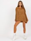 Wymiary swetra w rozmiarze one size mierzone na płasko: szerokość pod pachami – 69 cm, długość całkowita – 58 cm, długość rękawa – 55 cm.